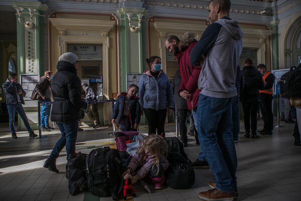 A crowd of people wait for a train to Poland at a railway station in the Western Ukrainian city of Lviv on Feb. 26.YURIY DYACHYSHYN/AFP/Getty Images