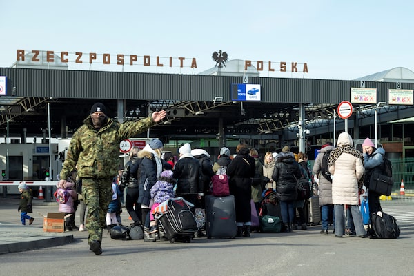 People arrive at the border crossing between Poland and Ukraine, in Medyka, Poland, on Feb. 26.JAKUB STEZYCKI/Reuters