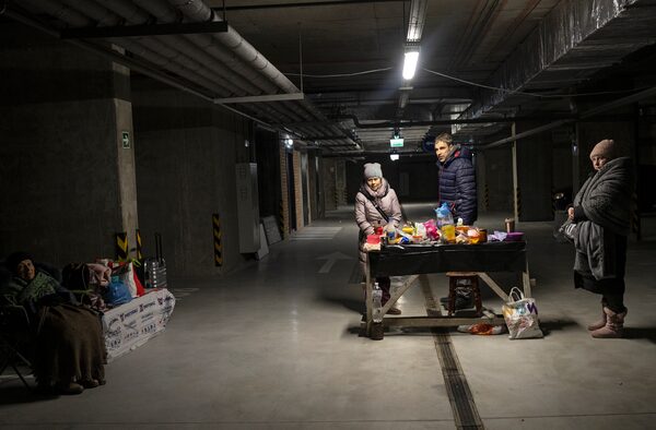 Civilians shelter in a parking garage in Kyiv after heavy fighting between Russian and Ukrainian forces on Saturday, Feb. 26.LYNSEY ADDARIO/The New York Times News Service