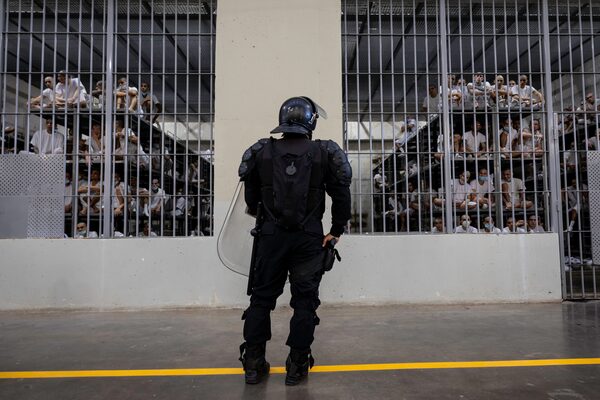 Accused gang members look out from their cell at the Counter Terrorism Confinement Center on Dec. 15, in Tecoluca, El Salvador.John Moore/Getty Images