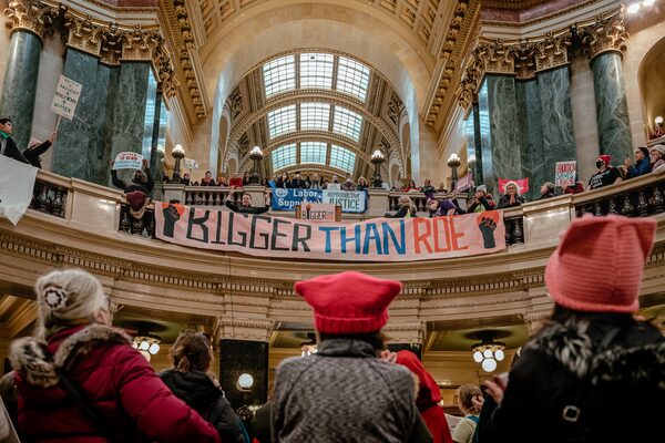 Demonstrators gather for a Bigger Than Roe rally after participating in a women's march for abortion rights, at the Wisconsin State Capitol in Madison on Jan. 22.JAMIE KELTER DAVIS/The New York Times News Service