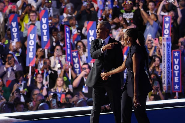 Former U.S. president Barack Obama and his wife Michelle Obama delivered a one-two punch at the Democratic National Convention on Aug. 20, urging Americans to back Kamala Harris in her 11th-hour presidential bid against Republican Donald Trump.