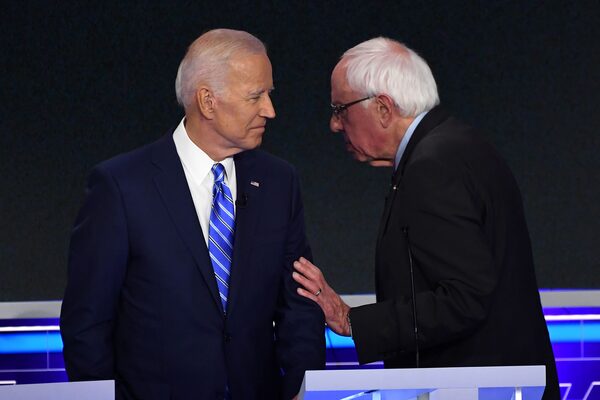 Democratic presidential hopeful U.S. Senator for Vermont Bernie Sanders (R) and former US Vice President Joseph R. Biden Jr. participate of the second Democratic primary debate of the 2020 presidential campaign season in Miami, Florida, June 27, 2019.SAUL LOEB/AFP/Getty Images