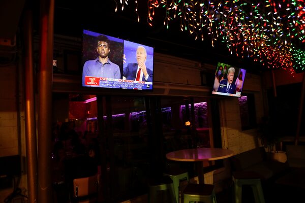 The dual town halls of U.S. Democratic presidential candidate Joe Biden and U.S. President Donald Trump are seen on televisions at Luv Child restaurant, in Tampa, Fla., on Oct. 15, 2020.OCTAVIO JONES/Reuters