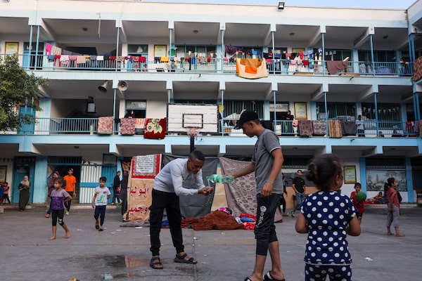 An internally displaced Palestinian washes from a water bottle as he and others take refuge in a United Nations school in the Rafah refugee camp, in the southern Gaza Strip on Oct. 14, 2023.MOHAMMED ABED/AFP/Getty Images