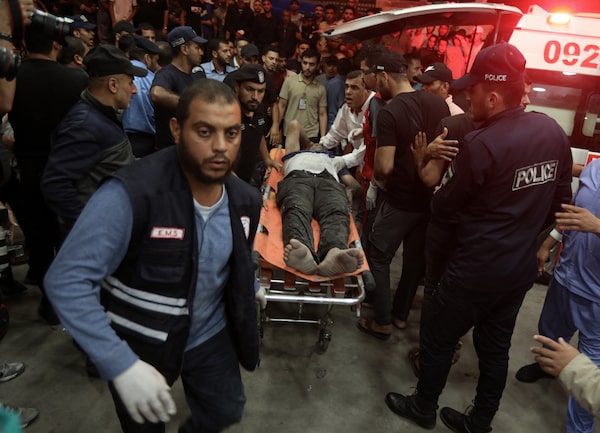 A man wounded in an air strike is brought to a hospital in Khan Younis, a city in the southern Gaza Strip now filling with refugees from Gaza City, on Oct. 14, 2023.Yousef Masoud/The New York Times News Service