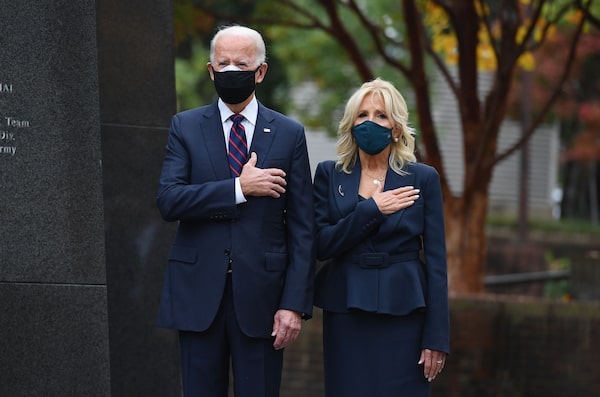 U.S. President-elect Joe Biden and his wife Jill Biden pay their respects during a Veterans Day stop at the Korean War Memorial Park in Philadelphia, Pennsylvania on Nov. 11, 2020.ANGELA WEISS/AFP/Getty Images