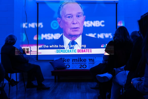 Michael Bloomberg is shown on a screen during the Nevada debate at a field office watch party in Brooklyn on Feb. 19, 2020.JEENAH MOON/Getty Images