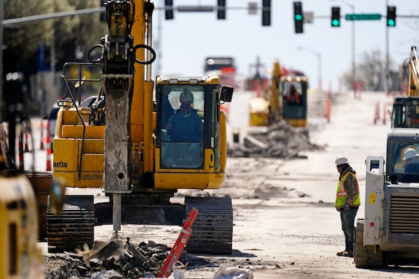 Workers toil on a project to replace old water lines under Main Street as part of work to update water and sewer systems as well as prepare the road for the expansion of a street car line in Kansas City, Mo. Wednesday, March 30, 2021.Charlie Riedel/The Associated Press