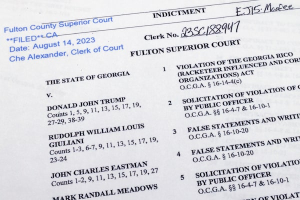 The indictment in Georgia against former President Donald Trump is photographed on Aug. 14.Jon Elswick/The Associated Press