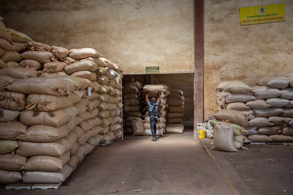 Seventy-kilogram bags of beans pile up at the plant in San Francisco de Macoris. The beans in the smaller room from a separate drying centre, are here for cleaning and processing.