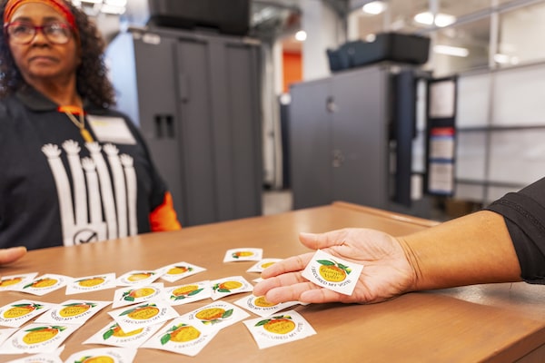 A woman holds up her sticker that signifies that she has officially voted in the state of Georgia, on Oct. 31, in Atlanta.Jason Allen/The Associated Press