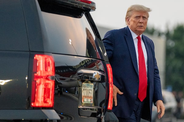 Former President Donald Trump walks to speak with reporters before departure from Hartsfield-Jackson Atlanta International Airport in Atlanta, on Aug. 24.Alex Brandon/The Associated Press