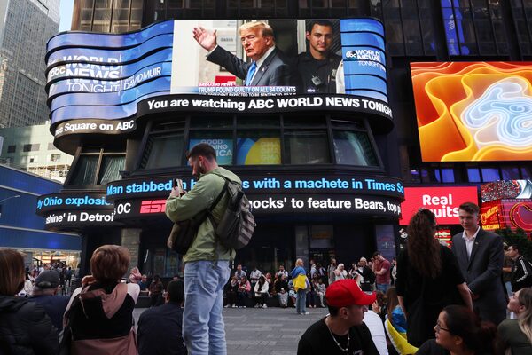 Screens display news of former U.S. president Donald Trump's conviction in his hush-money trial in Times Square on May 30, 2024, in New York.Michael M. Santiago/Getty Images