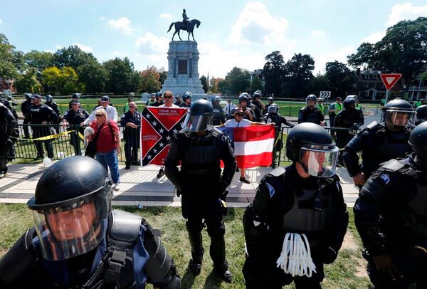 State police keep competing demonstrations apart at a statue of Confederate general Robert E. Lee in Richmond, Va., in 2017.Steve Helber/The Associated Press