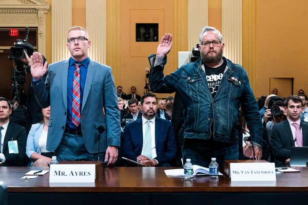 Stephen Ayres, who was a participant in the January 6 attack, and Jason Van Tatenhove, a former spokesperson for the Oath Keepers, are sworn in by the House select committee during the seventh public hearing in Washington on July 12.POOL/Reuters