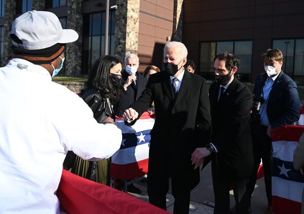 U.S. President-elect Joe Biden greets a supporter at an event at the Major Joseph R. Beau Biden III National Guard/Reserve Center in New Castle Airport on Jan. 19, 2021, before departing for Washington, DC.JIM WATSON/AFP/Getty Images