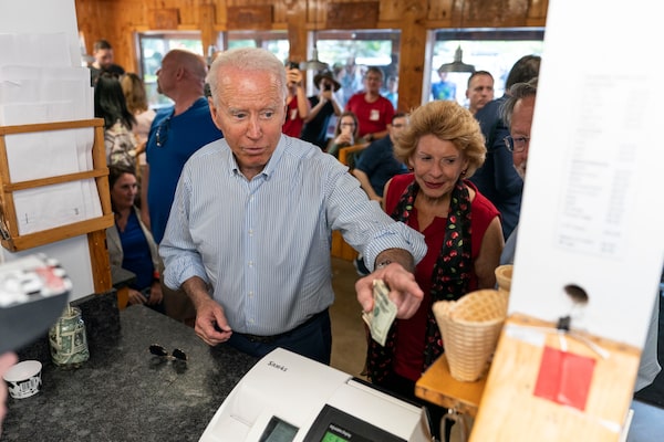 U.S. President Joe Biden buys ice cream at Moomers Homemade Ice Cream, with Sen. Debbie Stabenow and Sen. Gary Peters, on July 3, 2021, in Traverse City, Mich.Alex Brandon/The Associated Press