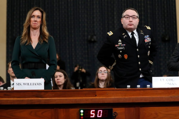 Lt. Col. Vindman, the National Security Council’s point-man on European affairs, listened in on Mr. Trump’s July 25 call with Ukrainian President Volodymyr Zelensky. He testified alongside Jennifer Williams, a foreign policy advisor to Vice President Mike Pence, on the third day of public testimony in the inquiry.
