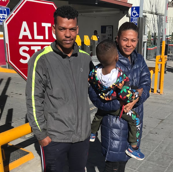 Bryan Povar, wife Baybeli Guerra and their son Jaendryk Povar Guerra ask for help along the border bridge.Adrian Morrow/The Globe and Mail