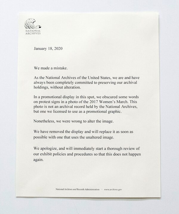 The archives issued the apology as thousands again gathered in Washington and in cities across the country Saturday for Women’s March rallies focused on issues such as climate change, pay equity and reproductive rights.