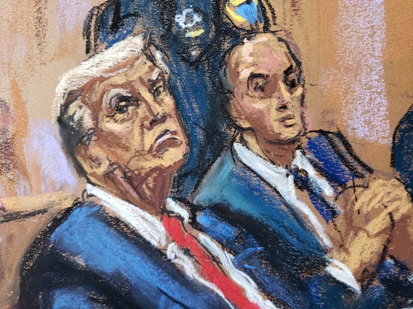 Former U.S. President Donald Trump listens as his lawyer Todd Blanche (not seen) argues with Judge Juan Merchan (not seen) during a court hearing on charges of falsifying business records to cover up a hush money payment to a porn star before the 2016 election, at a court in New York on Feb. 15 in this courtroom sketch.Jane Rosenberg/Reuters