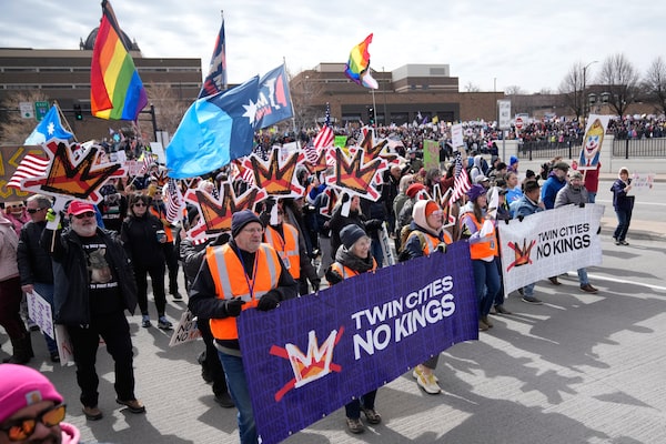 People carrying flags and banners march at a "No Kings" protest Saturday in St. Paul, Minn.Joe Scheller/The Associated Press