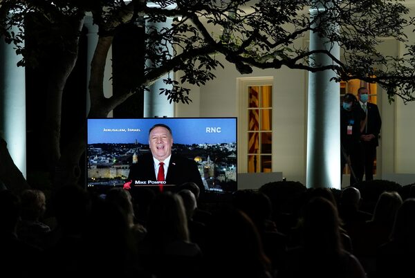 U.S. Secretary of State Mike Pompeo is seen giving his live address to the 2020 Republican National Convention on a monitor set up in the Rose Garden of the White House, in Washington, on Aug. 25, 2020.KEVIN LAMARQUE/Reuters