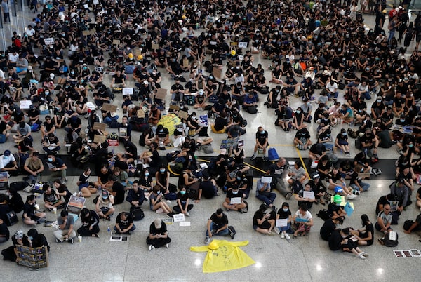 At the airport protesters, many dressed in black and seated on the ground, gradually filled the entire arrivals hall. They held up signs calling on the government to withdraw the extradition bill completely, while chants of “Free Hong Kong” reverberated around the cavernous glass and steel hall.