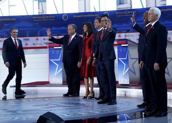 Republican presidential candidates (L-R), North Dakota Gov. Doug Burgum, former New Jersey Gov. Chris Christie, former U.N. Ambassador Nikki Haley, Florida Gov. Ron DeSantis, Vivek Ramaswamy, U.S. Sen. Tim Scott (R-SC) and former U.S. Vice President Mike Pence participate in the FOX Business Republican Primary Debate at the Ronald Reagan Presidential Library on September 27, 2023 in Simi Valley, California.Mario Tama/Getty Images