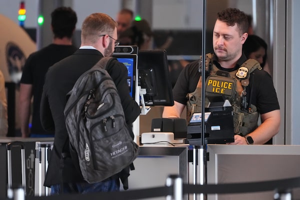 An ICE officer mans a TSA checkpoint at Pittsburgh International Airport in Imperial, Pa.Gene J. Puskar/The Associated Press