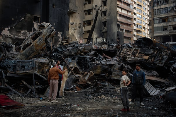 Residents gather near charred cars and buildings, at the site of Wednesday's Israeli air strike, in Beirut.Emilio Morenatti/The Associated Press