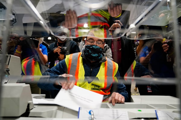 John Hansberry of the Philadelphia City Commissioners office demonstrates an extraction machine at the city's mail-in ballot sorting facility on Oct. 26.Matt Slocum/The Associated Press/The Associated Press