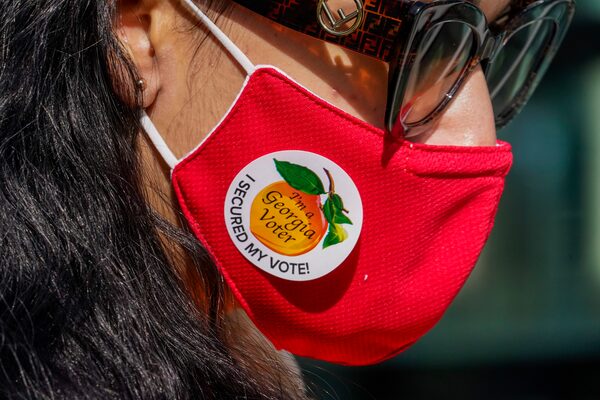 A woman wears an 'I'm a Georgia voter' sticker on her mask on Nov. 3's election day.Brynn Anderson/The Associated Press