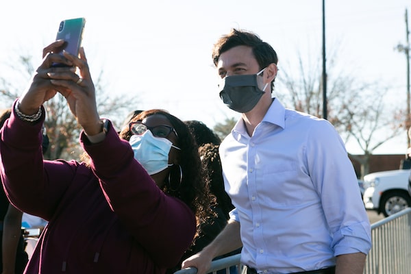 Mr. Ossoff takes a photo with a supporter at a Dec. 5 rally in Conyers.Jessica McGowan/Getty Images
