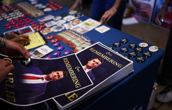 Attendees take flyers and buttons during a vigil in memory of right-wing activist Charlie Kirk in Tempe, Ariz., on Monday.CHARLY TRIBALLEAU/AFP/Getty Images