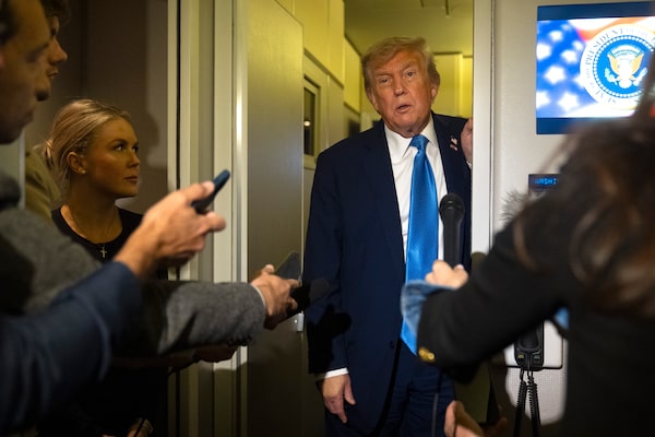 President Donald Trump speaks with reporters as White House press secretary Karoline Leavitt listens while flying aboard Air Force One en route from Calgary, Canada to Joint Base Andrews, Md., late Monday, June 16, 2025. (AP Photo/Mark Schiefelbein)Mark Schiefelbein/The Associated Press