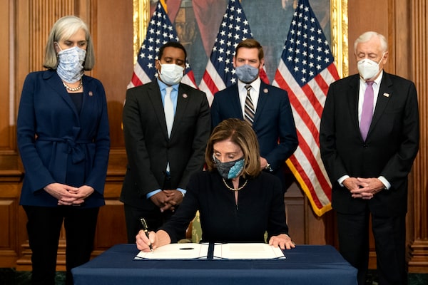 Speaker of the House Nancy Pelosi signs an article of impeachment against U.S. President Donald Trump at the U.S. Capitol on Jan. 13, 2021 in Washington.Stefani Reynolds/Getty Images