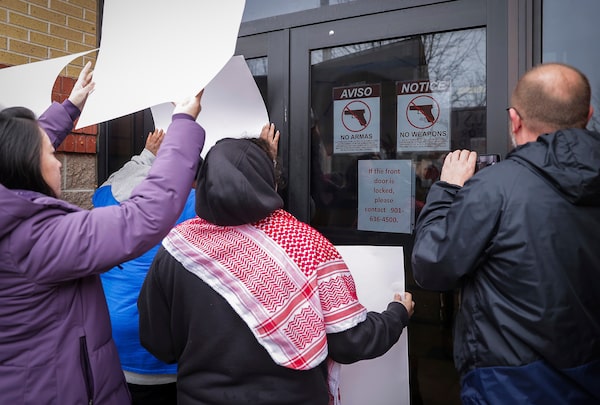 Activists knock on the locked door of the Memphis Police Department's Ridgeway Station during a protest in honor of Tyre Nichols, on Jan. 29 in Memphis.Patrick Lantrip/The Associated Press