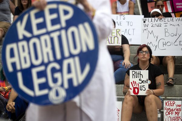 Protesters hold signs as Barbara DeVane, of the Tallahassee National Organization for Women, speaks outside the Florida Historic Capitol, June 24, 2022, in Tallahassee, Fla., during a rally protesting the Supreme Court's overturning of Roe v. Wade.Chasity Maynard/The Associated Press