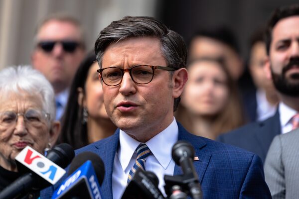 Speaker of the House Mike Johnson takes part in a news conference at Columbia University, in New York, on April 24.Michael M. Santiago/Getty Images