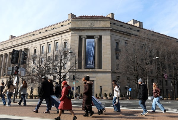 A banner featuring President Donald Trump on the U.S. Department of Justice building in Washington in February.Rahmat Gul/The Associated Press