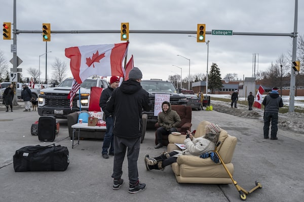 Protestors gather Feb. 10, 2022, at the Ambassador Bridge in Windsor, Ont., where a blockade is preventing daily trade between Canada and the U.S.Barbara Davidson/The Globe and Mail
