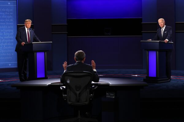 U.S. President Donald Trump and Democratic presidential nominee Joe Biden participate in the first presidential debate moderated by Fox News anchor Chris Wallace (centre), at Case Western Reserve University on Sept. 29, 2020, in Cleveland.Scott Olson/Getty Images