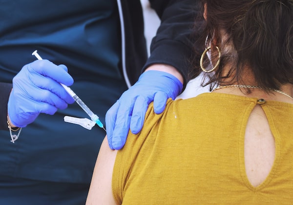 A woman receives a COVID-19 vaccine outside the Karsh Family Social Service Center, in Los Angeles, Calif., on March 18, 2021.Mario Tama/Getty Images