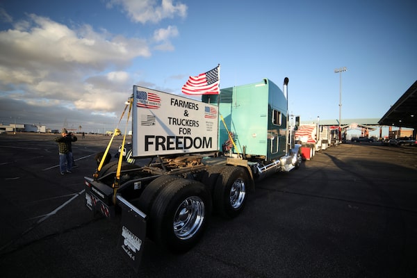 Truckers and their supporters start to gather before a convoy leaves the following morning bound for the nation's capital to protest COVID-19 vaccine mandates, in Adelanto, Calif., on Feb. 22.DAVID SWANSON/Reuters