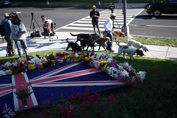 People leave flowers for Queen Elizabeth at a makeshift memorial outside the British Embassy in Washington, DC, on Sept. 9.BRENDAN SMIALOWSKI/AFP/Getty Images