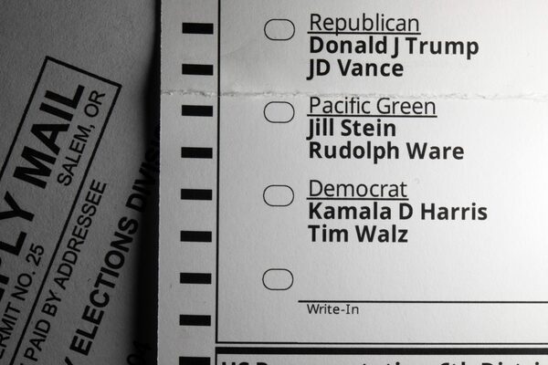 A mail-in official ballot for the 2024 general election in the United States is shown in Tigard, Ore., on Oct. 31.Jenny Kane/The Associated Press