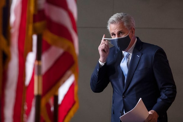 House Minority Leader Kevin McCarthy removes his face mask as he arrives for a news conference on Capitol Hill, in Washington, on June 25, 2020.Carolyn Kaster/The Associated Press