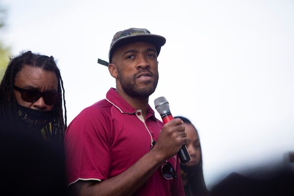 Mandela Barnes speaks to the crowd gathered at Civic Center Park located outside of the Kenosha County Courthouse, in Kenosha, Wisconsin, Aug. 29, 2020.JIM VONDRUSKA/Reuters